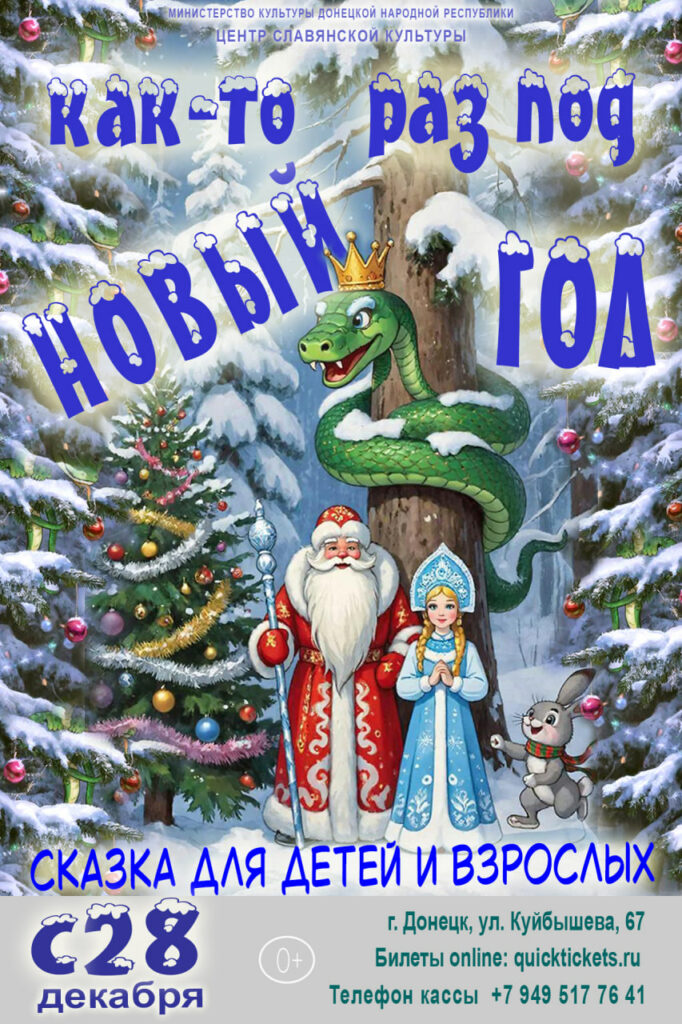 Новый Год – время чудес и волшебства! Невероятные истории случаются в праздничные дни: сказка оживает даже для взрослых! А дорогу в эту сказку прокладывают добрые дела… Поделитесь своим добром и узнайте, где оно живёт в волшебной стране! Приглашаем Вас в добрую сказку, где с нашими героями, как-то раз, под Новый Год, приключится удивительная история… (После просмотра театрализованного представления детей ожидает игровая программа с Дедом Морозом и Снегурочкой у Новогодней ёлки!)