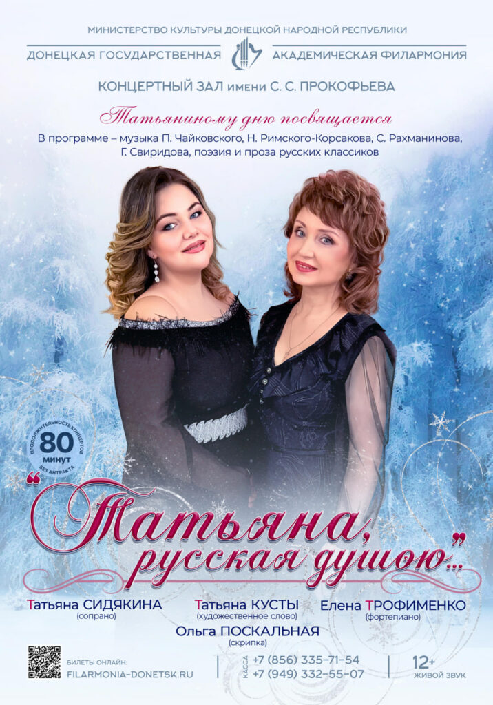 Участвуют: Татьяна Сидякина (сопрано), Елена Трофименко (фортепиано), Ольга Поскальная (скрипка).