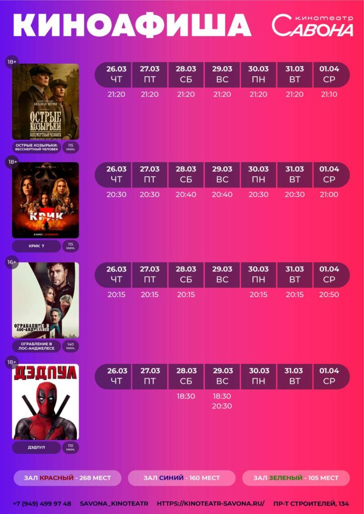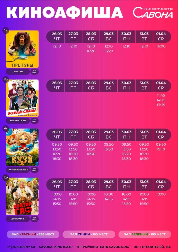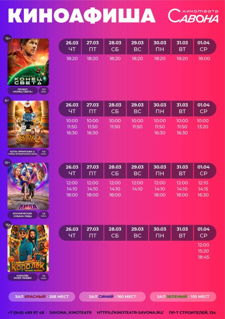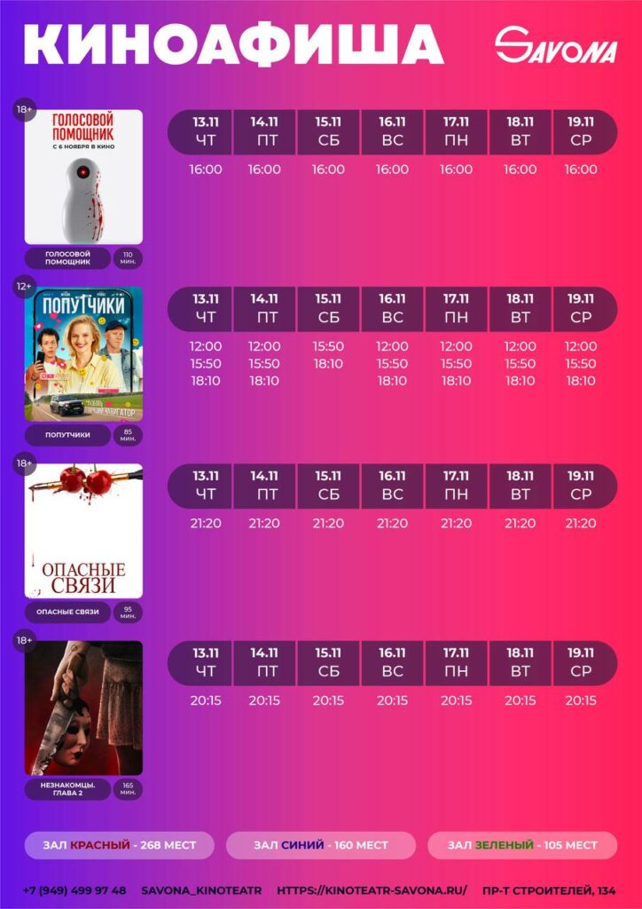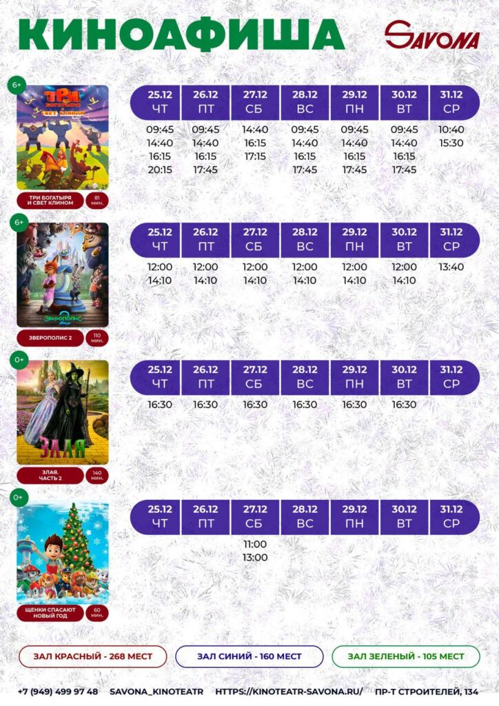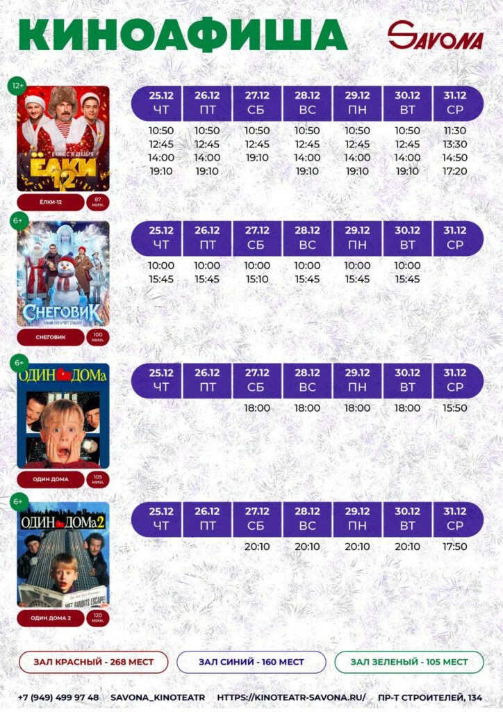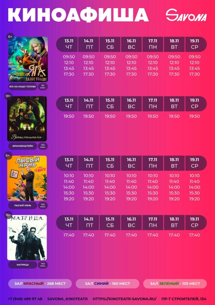 Кинотеатр SAVONA — это современный мультиплекс с комфортными залами и новейшим оборудованием. У нас вы сможете насладиться просмотром фильмов в высоком качестве и ощутить атмосферу настоящего кинозала. В нашем кинотеатре проходят премьеры российских и зарубежных фильмов, а также специальные показы и мероприятия для всей семьи.